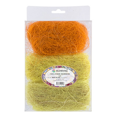 Сизаль — натуральное грубое волокно, получаемое из листьев растения Agava sisolana из рода Агава. Сизаль используют в качестве наполнителя, так как воздушный эффект придает утонченность и свежесть изделию. Волокном декорируют формы из пенопласта, формируя нужный рельеф с помощью проволоки или нитей. Данный материал также распространен во флористике, упаковке подарков, используется как наполнитель в цветочных композициях. Используется при создании топиариев, в подарочных корзинах с фруктами, чайными и кофейными наборами, в свит дизайне и пр.Упакока 30 г