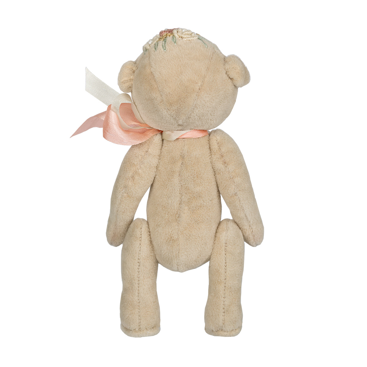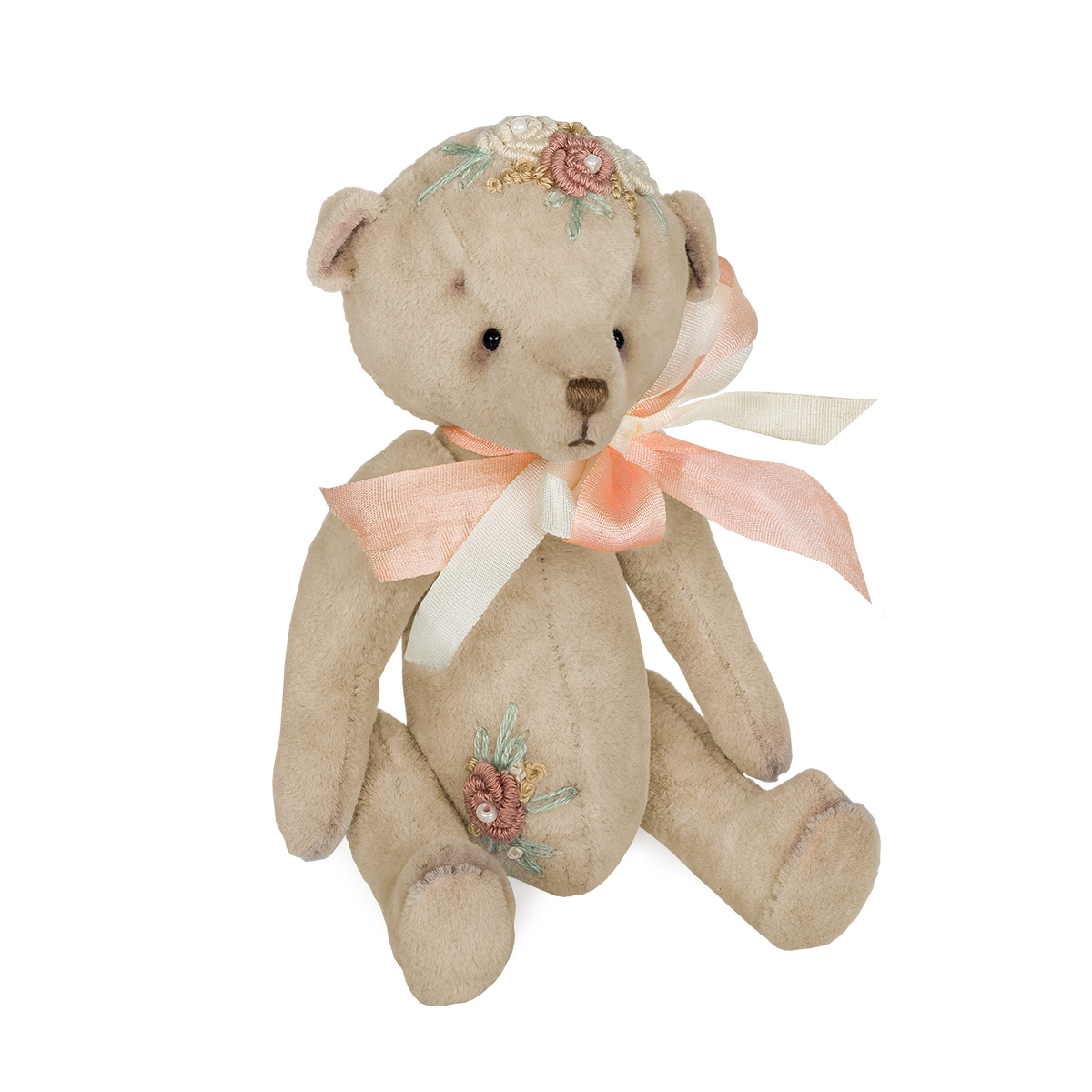 Игрушка выполняется по классической тедди-технологии - это технология изготовления игрушек с подвижным шплинтовым креплением лап и головы. В качестве наполнителя используется древесная стружка. Миниатюрная игрушка украшена цветочной вышивкой и бантом из шелковых лент.