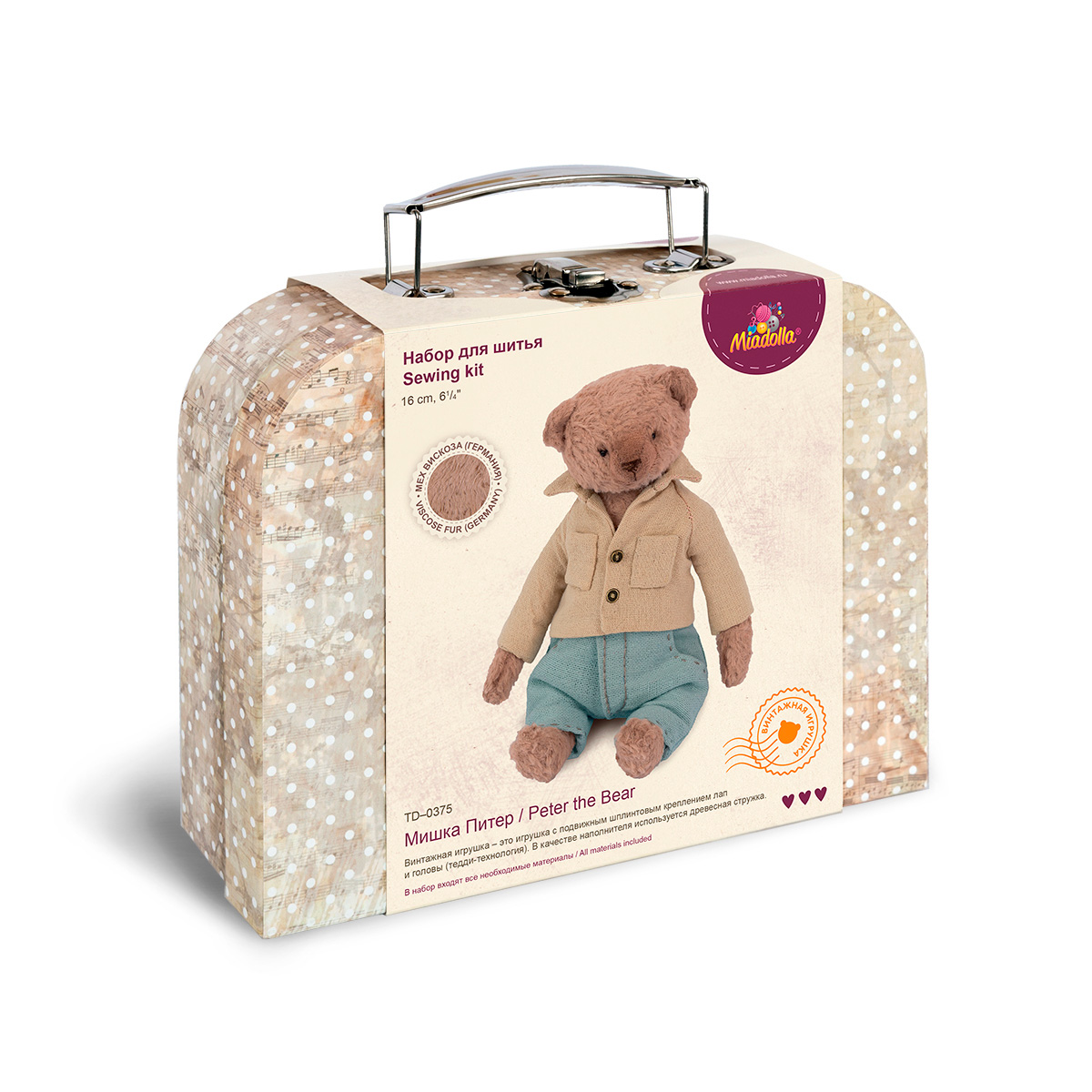 Игрушка выполняется по классической тедди-технологии - это технология изготовления игрушек с подвижным шплинтовым креплением лап и головы. В качестве наполнителя используется древесная стружка. Уникальной особенностью набора является мех из натуральной вискозы премиум-качества , с которым традиционно работают профессиональные теддисты. Набор имеет упаковку в виде винтажного чемодана с застежкой, а также комплектуется паспортом для игрушки и кожаной нашивкой hand made.