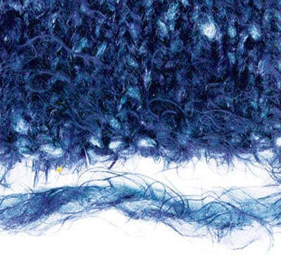 Три скрученных нити: две нити типа "распушенный акрил" одного цвета; полиамидная ворсовая, длина ворса 2-2,5 см, нить типа "травка" другого цвета. Вес 50 г/80 м. Уход за готовым изделием: ручная стирка t-40, не гладить, щадящий режим химчистки, не отбеливать, не сушить в барабанной сушилке. Рекомендуемый диаметр спиц для пряжи 4.0-4.5 мм. На вязаном изделии размером 10х10 см получается 25 рядов по 20 петель.