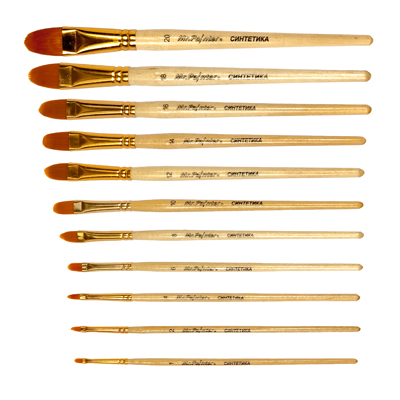 Кисти из СИНТЕТИКИ прочные, упругие, эластичные, что способствует хорошей наполняемости кисти и ровному нанесению краски. Предназначены для работ с тяжелыми красками: маслом, акрилом, темперой, гуашью; хорошо удерживают жидкость. Благодаря ПЛОСКО-ОВАЛЬНОЙ форме, ей можно писать как обычной плоской кистью и, в то же время, в перпендикулярном положении к поверхности - как круглой