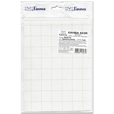 Канва К03R "Гамма"-ткань для вышивания. Состав:95%хлопок 5%терилен Кол-во клеток: в 10см-43,в 1дюйме-11. Размер канвы: 50х50см. Цвет:белый в клетку Канва используется в качестве основы для вышивания крестом, полукрестом. Канва достаточно жесткая, плотная и позволяет вышивать без использования пялец. Каждый отрез упакован в пакет с евро-слотом, есть штрих-код. Подобную упаковку удобно использовать в розничных магазинах типа "супермаркет". В продаже также имеется канва К03R "Гамма" в рулоне . Рекомендации по удалению лески после вышивки: Аккуратно подденьте леску пинцетом. Оберните леску вокруг пинцета 3 раза, чтобы зафиксировать ее. Плавно, с небольшим усилием, потяните на себя и удалите из канвы. Разлинованная сетка позволяет вам легче воспринимать схему рисунка, считать клеточки канвы и перемещаться по ткани.