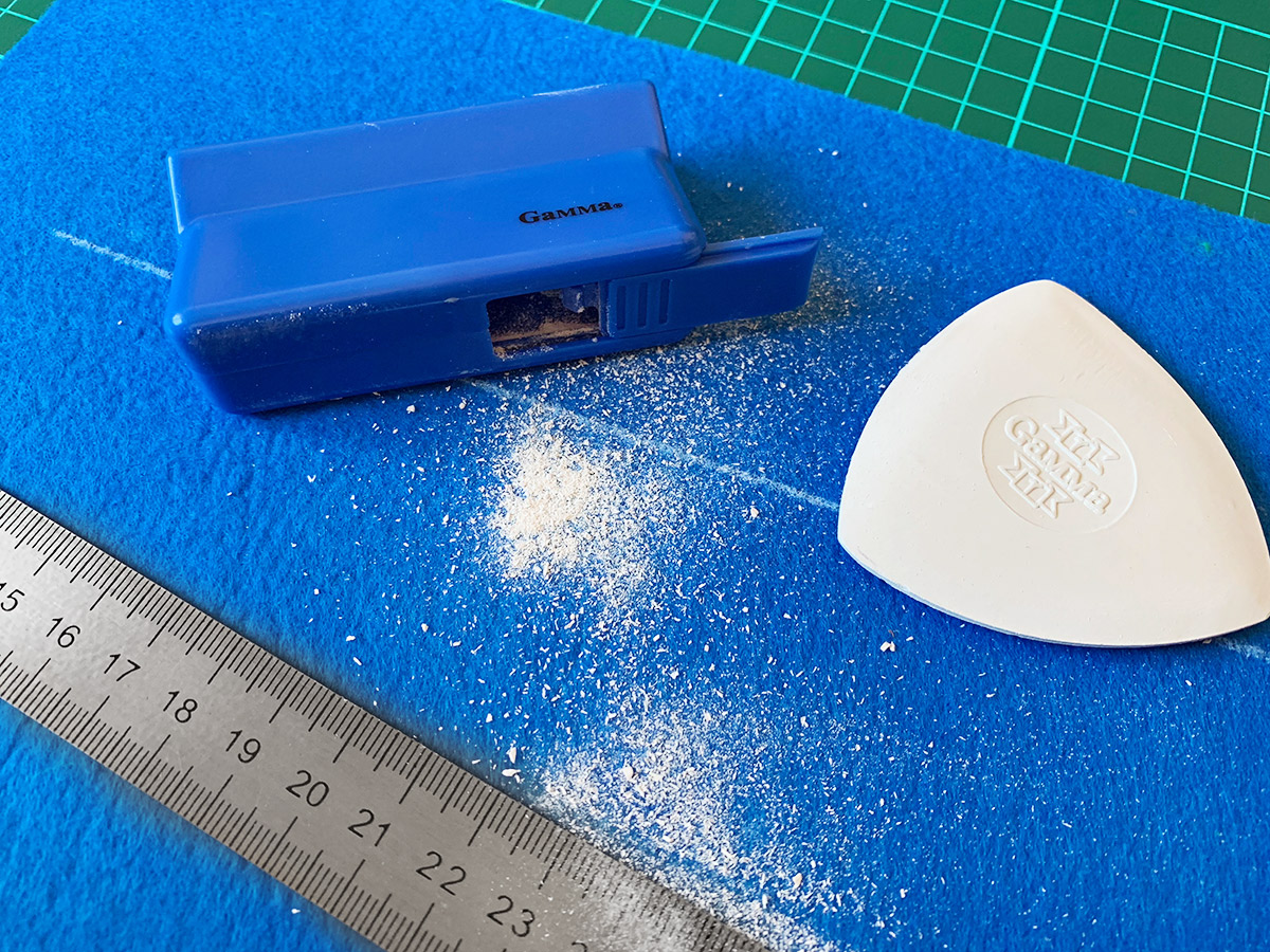 Нормальной твердости, треугольной формы с содержанием воска, водостойкий, для обмеловки различных тканей и замши.