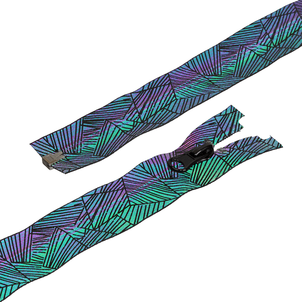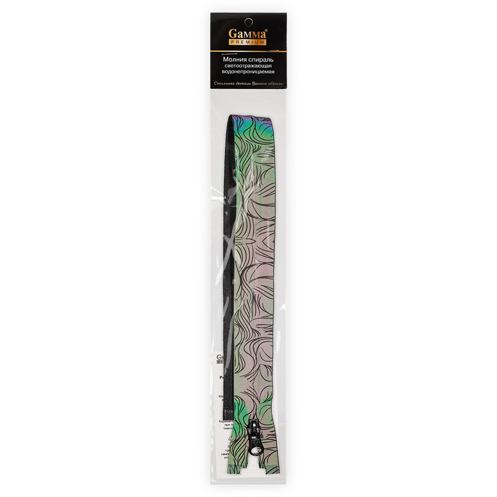 Молния светоотражающая, водонепроницаемая, с нанесенным рисунком и краска с перламутровым эффектом.