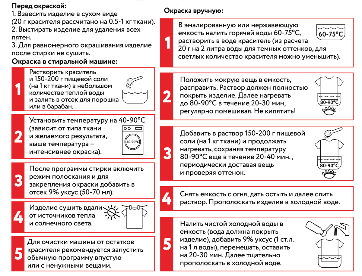 Внимание! Интенсивность и оттенок выбранного цвета зависит от типа ткани, ее состава, количества красителя, а также от температуры окрашивания. По возможности всегда проводите предварительное окрашивание на образце ткани или на ненужной вещи.