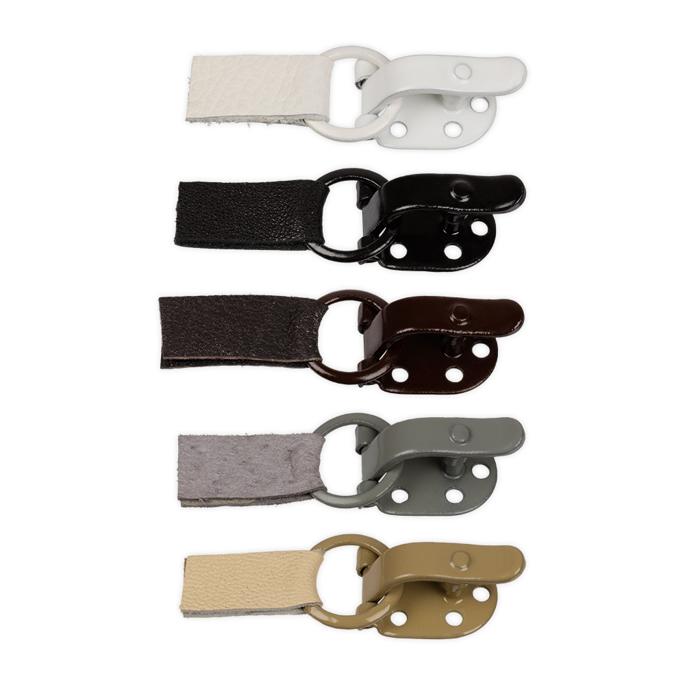 Крючки состоят из двух компонентов: металлический крючок и петелька, за которую крепится крючок. Зажим удобен и надежен. Кожаный ремешок шубного крючка легко заменяется в случае необходимости.