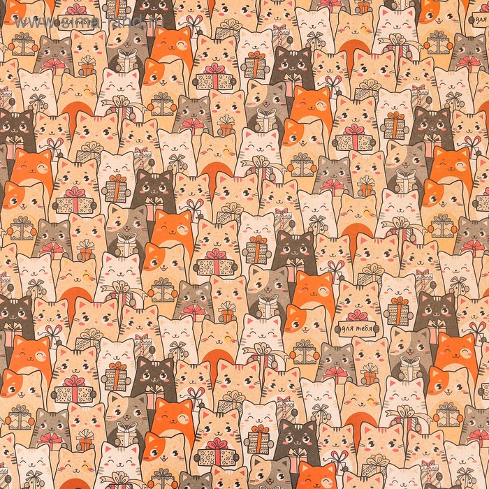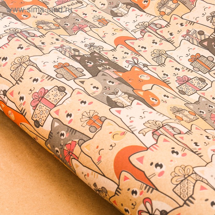 - Бумага упаковочная крафтовая «Котики с подарками» 70 × 100 см 2 листа