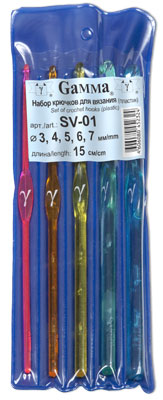 В набор входят крючки размером: 3; 4; 5; 6; 7 мм. Крючки пластиковые цветные легкие, удобные в работе.