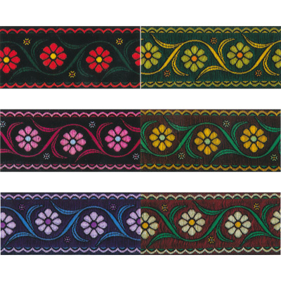 Жаккардовая лента с растительным орнаментом - это лента с рисунком, который не наносится сверху, а образуется плетением нитей самой тесьмы, и благодаря этому никогда не сотрется и не поблекнет. Жаккардовая лента выглядит как вышивка гладью, и придает фольклорный колорит любому изделию. Используется в качестве декоративного элемента при производстве одежды, художественных изделий, сувенирной атрибутики и т.п.Намотка бобин - 10 м.