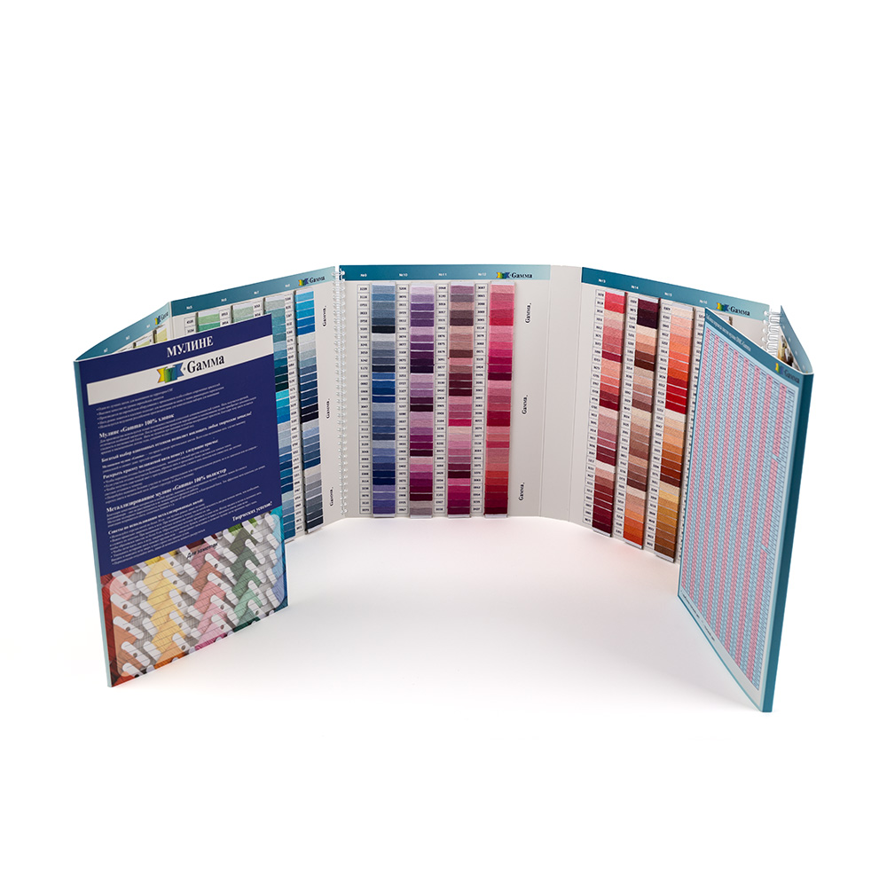 Удобная намотка настоящих ниток мулине "Gamma" на широкие картонные плашки делает процесс подбора цвета быстрым и легким.
