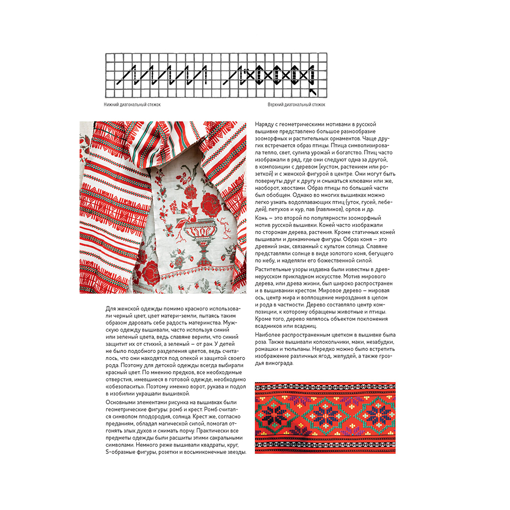 Мотивы были собраны из дореволюционных альбомов с вышивальными узорами и заботливо отреставрированы с применением современных технологий, чтобы облегчить работу рукодельницам. В книгу включены как совсем небольшие мотивы, так и крупные изображения; не только однотонные и двуцветные, но и многоцветные схемы, в которых каждый цвет имеет символическое значение.