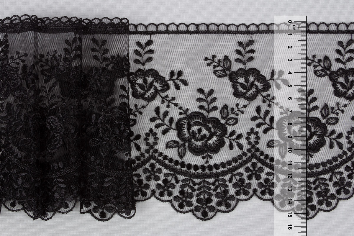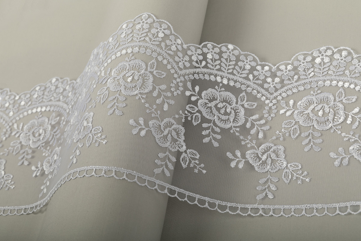 Кружево на сетке представляет собой кружевное полотно, основа которого сетка или фатин. Применяется для декоративной отделки лёгкой женской одежды и домашнего текстиля.