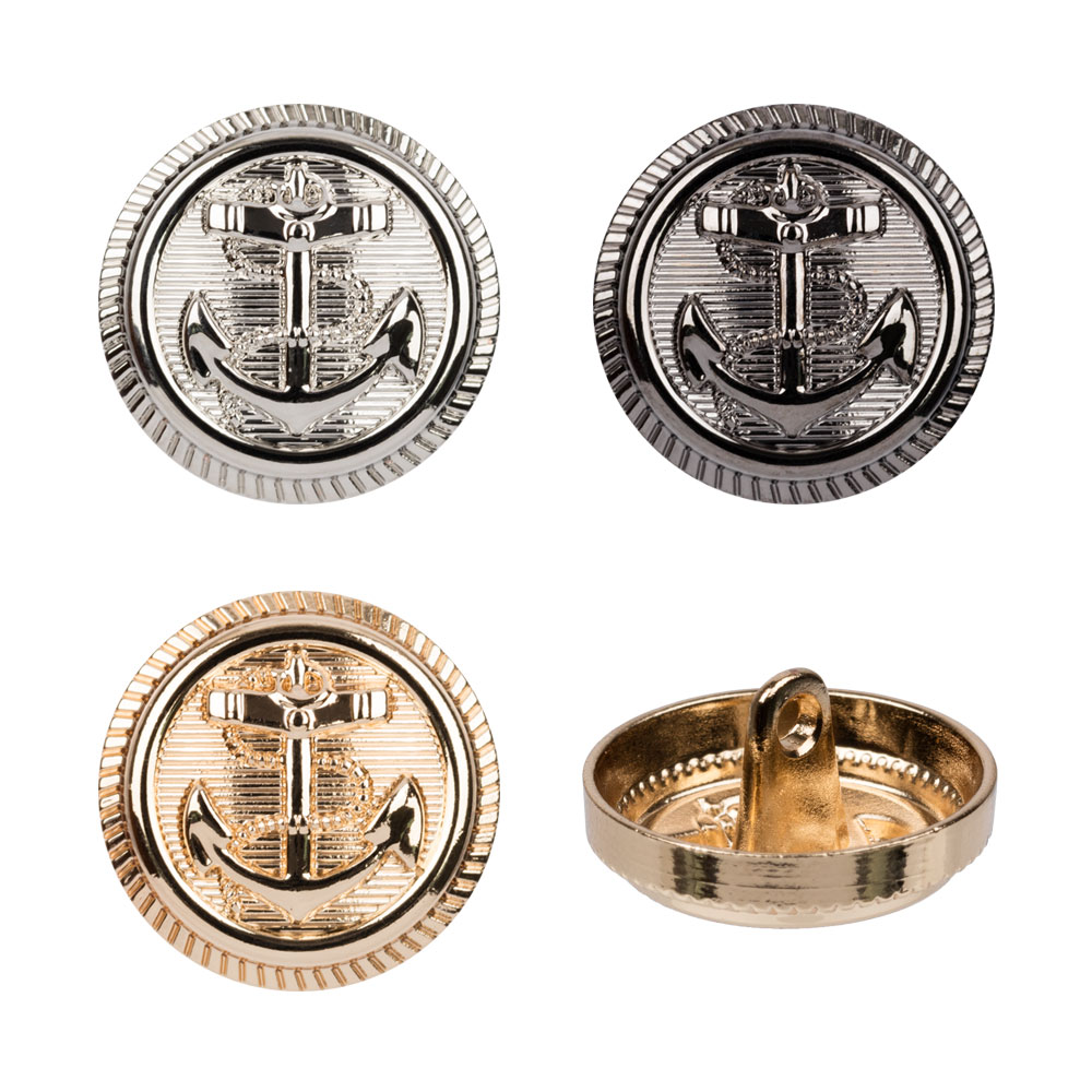 Пуговица круглой формы, рельефная, на поверхности изображен якорь, тип крепления на ножке.