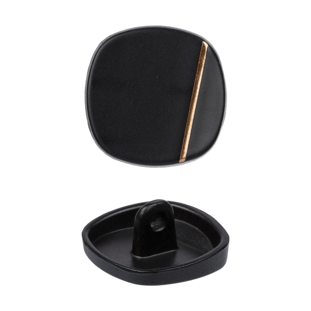 Пуговица круглой формы, с рельефной окантовкой, с пластиковой сердцевиной, тип крепления на ножке.
