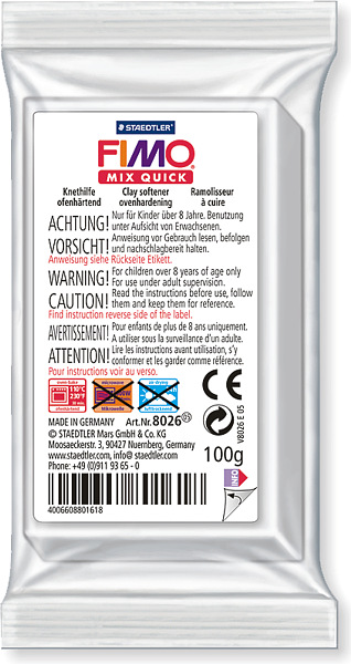С помощью Fimo Mix Quick Вы сможете вернуть пластике Fimo прежние свойства! Достаточно смешать небольшой кусочек размягчителя с пластикой. Размягчитель Fimo делает структуру застаревшей пластики более пластичной и однородной. Не изменяет цвет полимерной глины, но возвращает ее первоначальные свойства, позволяет сэкономить – не выбрасывать старую пластику. Одной пачки FIMO Mix Quick хватает надолго, потому что размягчитель очень эффективен. Данный размягчитель идеально подходит для пластики Fimo Soft, Fimo Classic, Fimo Effect и Fimo Puppen.