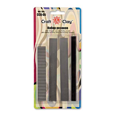 В наборе: 3 лезвия, сменная резиновая ручка-держатель. Лезвия изготовлены из высококачественной стали и предназначены для фигурной резки пластика: жёсткое - для получения ровных пластин и колбасок, гибкое - для закруглённых деталей, рифлёное - для создания рельефа.