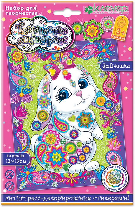 Волшебство техники «антистресс-декорирование стикерами» вовлекает в процесс творчества даже самых маленьких детей: ребёнок старше 3 лет вместе с мамой наклеит узорные разноцветные стикеры и блестящие голографические элементы на изображение трогательного зайчика на поляне среди волшебных цветов, и картинка заиграет яркими красками и радужными огоньками – прямо как в сказке!