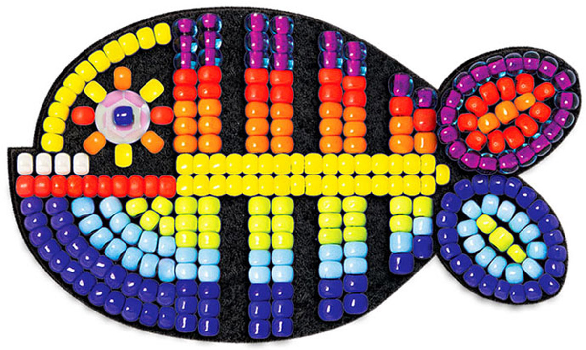 Дети от 10 лет и взрослые создадут замечательное украшение или подарок своими руками - рыбу Пиранью с цветными радужными костяшками: нужно вырезать фетр по шаблону и, соблюдая последовательность шагов в инструкции, аккуратно нашить на фетр нити с разноцветными бисеринами и пайетку.