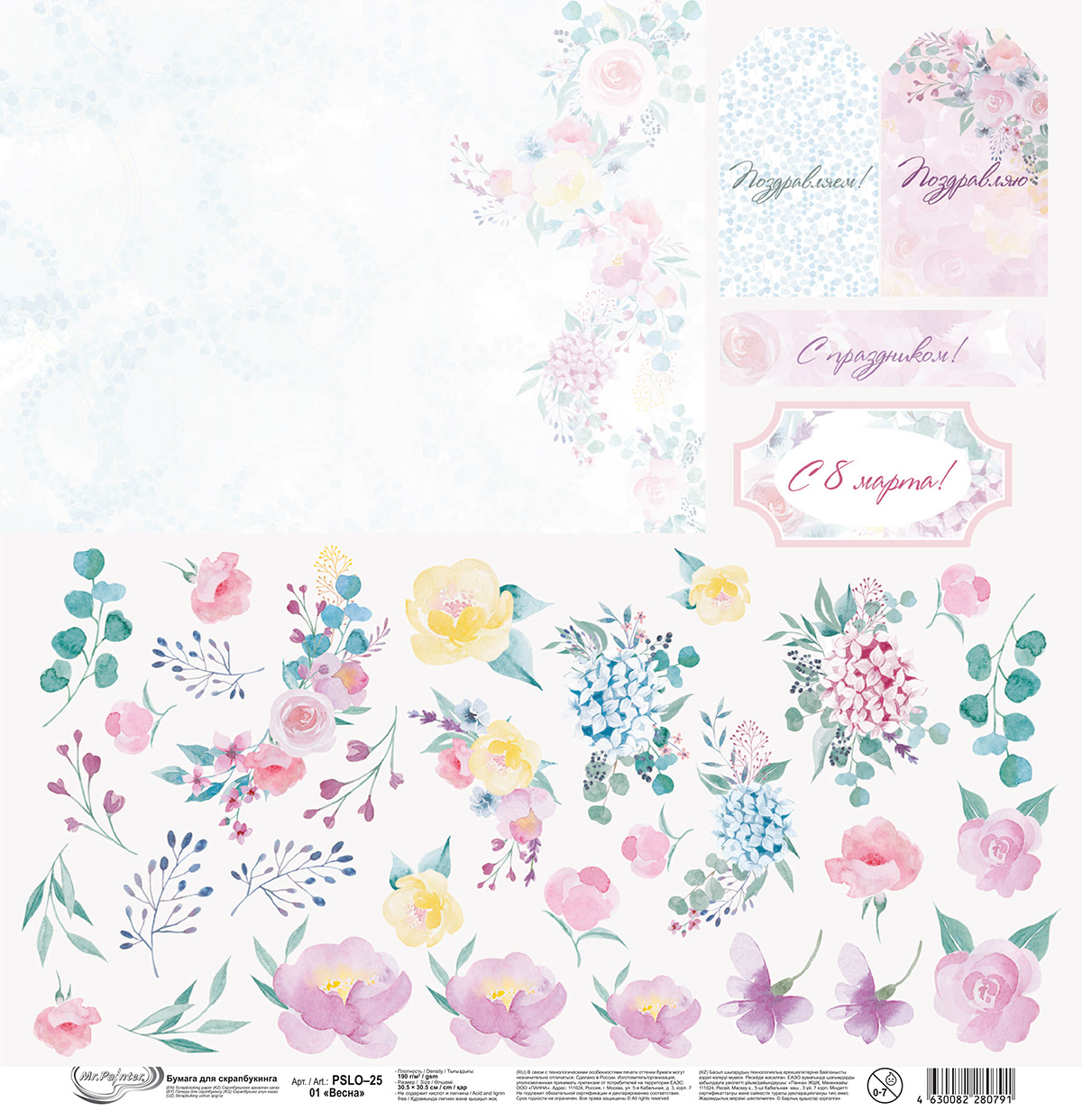 Бумага для скрапбукинга "Mr.Painter" PSLO-25 Идеальное решение для создания открыток, изучения основ кардмейкинга. Из 1 листа вы сможете самостоятельно сделать тематическую открытку! Для работы вам понадобится клей-карандаш или объемные клеевые подушечки арт. DST-02 и ножницы. Вырезайте элементы собирайте их на основе, творите, создавайте свои композиции и дарите эмоции близким вместе с рукодельными открытками!