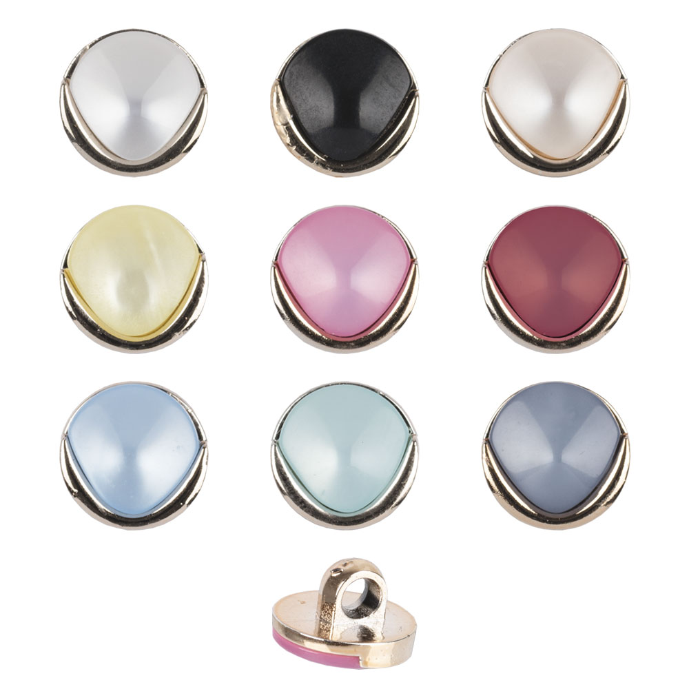 Пуговица блузочная, круглой формы на ножке, с пластиковой окантовкой под металл, с перламутровым эффектом.