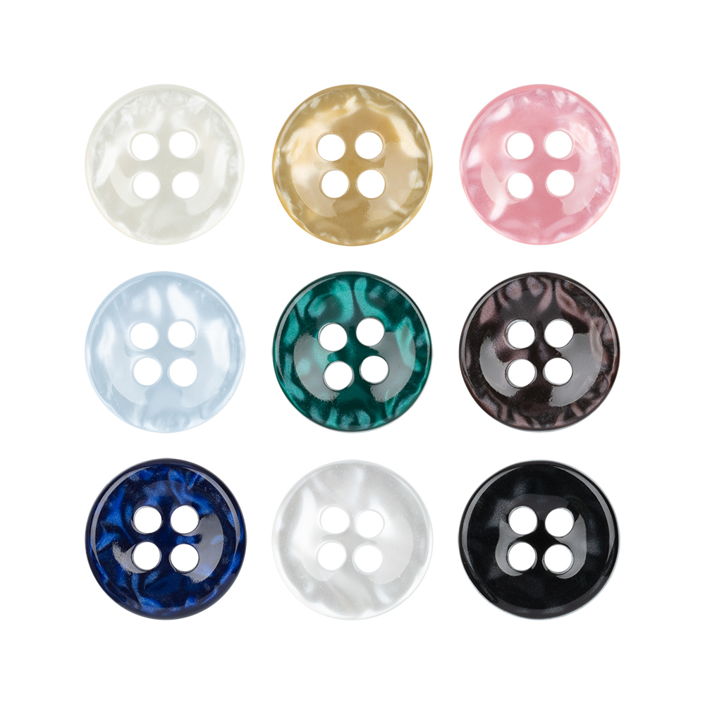 Пуговица блузочная, на 4 прокола, круглой формы, с перламутровым эффектом.