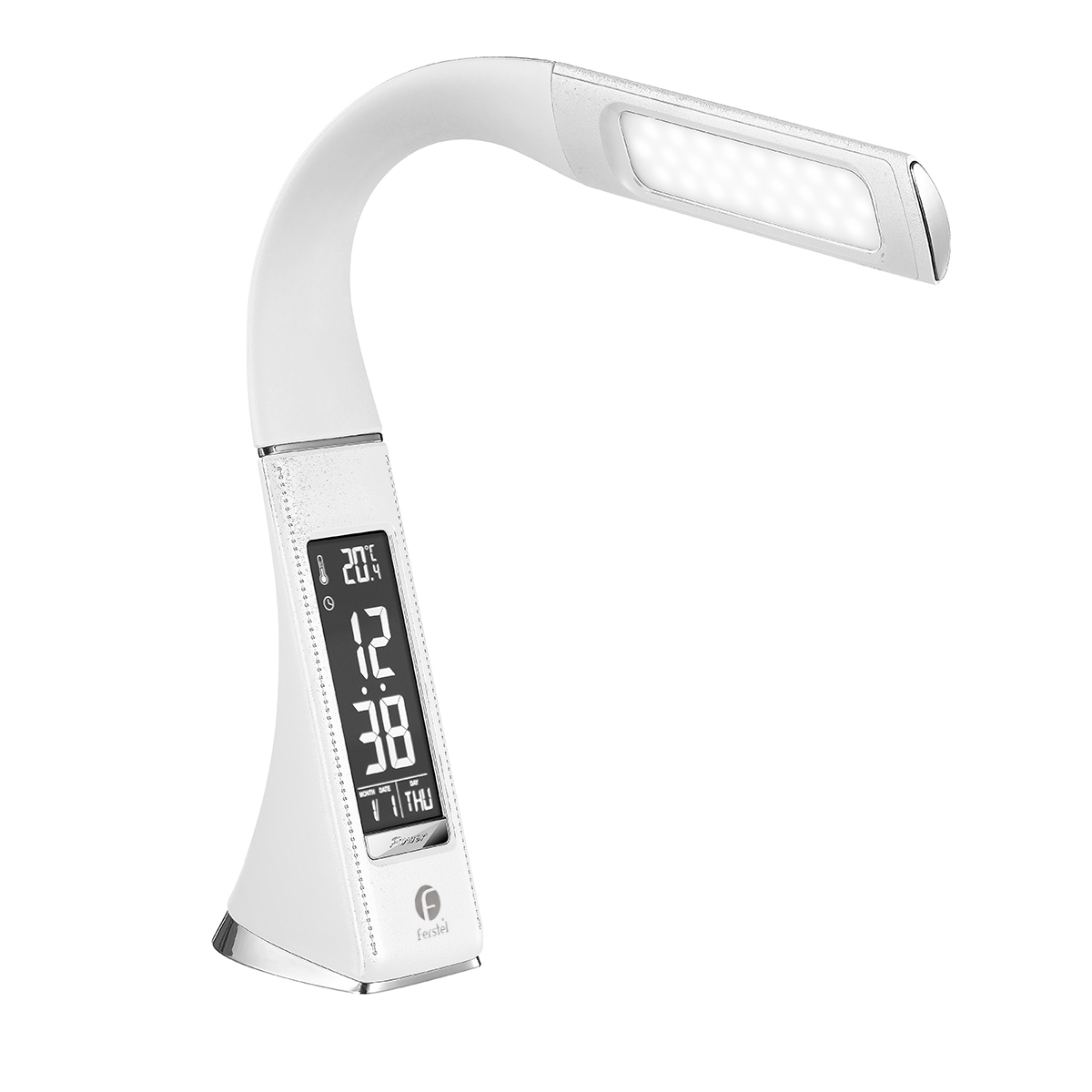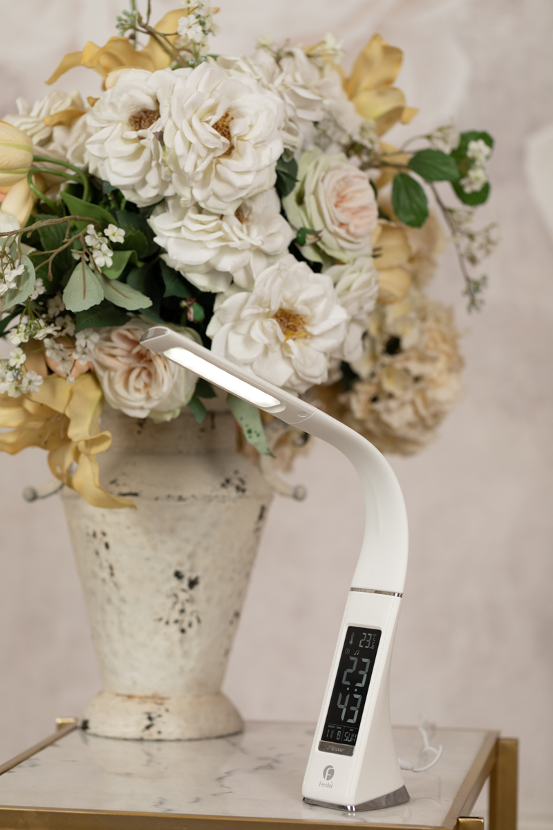 Простой и при этом элегантный дизайн лампы FR-42 прекрасно впишется в любой интерьер. Благодаря гибкому корпусу, выполненному в современном стиле "под кожу", свет можно направлять под разными углами. В нижней части корпуса имеется дисплей, показывающий важную для нас в течение всего дня информацию: время, дата, температура воздуха. Также лампа имеет функцию будильника, что пригодится как в офисе, для напоминаний, так и дома. Для бесперебойного питания часов дисплея в комплекте идет батарейка CR2032 .