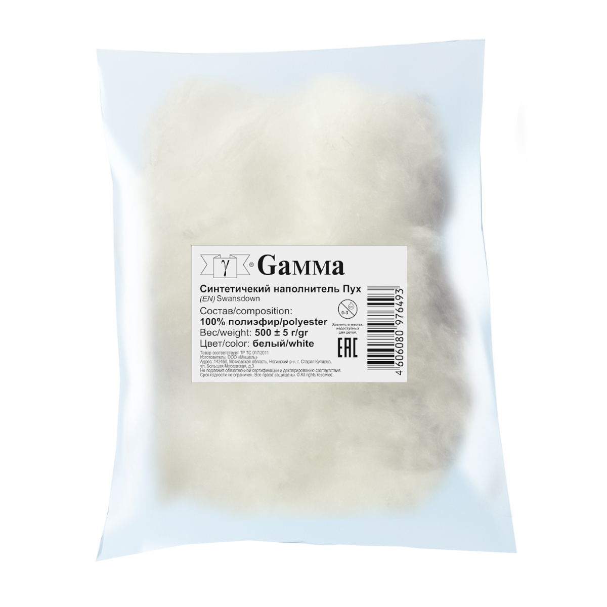 - "Gamma" Лебяжий пух (синтетический наполнитель) 100% полиэфир 500 г ± 5 г белый